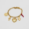 Alla catena sono appesi diversi ciondoli portafortuna e simbolici — un cuoricino, un cuore sacro, un cornicino, una croce e una moneta — ciascuno con la sua identità e il suo significato. Insieme raccontano una storia di protezione, amore e fortuna, trasformando il bracciale in un vero charm bracelet da indossare ogni giorno.