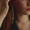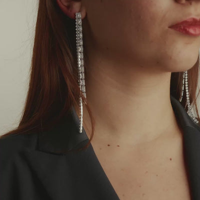 Gli Orecchini Skine sono orecchini eleganti e raffinati in acciaio inox, caratterizzati da due fili sottili pendenti su ciascun orecchino, ognuno impreziosito da cristalli Swarovski scintillanti.